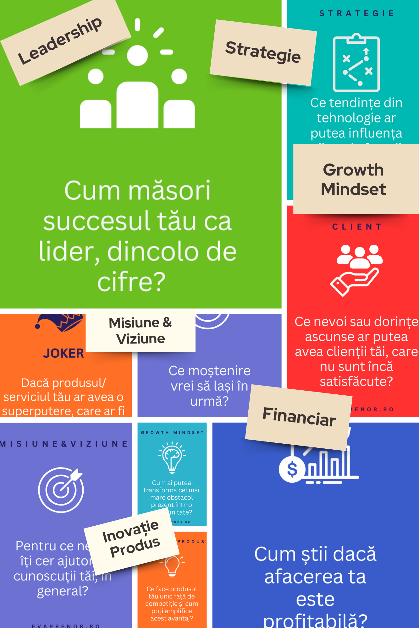 Cartonașele Antreprenorului sunt un set de 77 de carduri cu întrebări cheie din 7 domenii strategice ale business-ului tău: